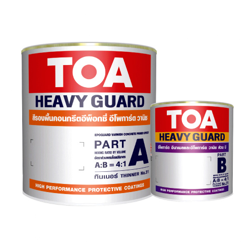 สีรองพื้น อีโพการ์ด วานิช (P/A+B) TOAมีคุณสมบัติในการยึดเกาะ และแทรกซึมลงสู่พื้นผิวได้ดีทนทานต่อน้ำ , กรดอ่อน , ด่างอ่อน , สารเคมี ,การขูดขีด และการฉีกขาดได้ดีเหมาะสำหรับใช้ทาเป็นสีรองพื้นบนพื้นผิวคอนกรีต ในระบบอีพ็อกซี่ เช่น ผนัง, พื้นโรงงาน