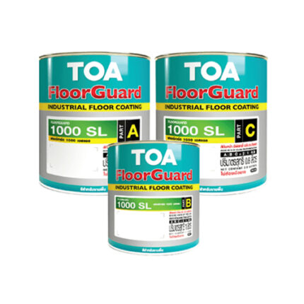 สีทับหน้า Part A+B+C จากแบรนด์ TOA รุ่น ฟลอร์การ์ด 1000 SL เป็นสีทับหน้าอีพ็อกซี่ 3 ส่วน ฟิล์มหนา 1-3 มิลลิเมตร สำหรับงานพื้นภายใน มีความเงาสูงที่ไม่มีส่วนผสมของตัวทำละลาย สามารถปรับระดับผิวหน้าเรียบด้วยตัวเอง เป็นพื้นไร้รอยต่อ เหมาะสำหรับพื้นคอนกรีตที่มีการใช้งานหนัก ทำความสะอาดง่าย ไม่เก็บฝุ่น ทนต่อแรงกระแทกและการกัดกร่อนจากสารเคมีได้ดีเยี่ยม อีกทั้งยังมีส่วนผสมของสารไมโครแบนสำหรับป้องกันแบคทีเรีย